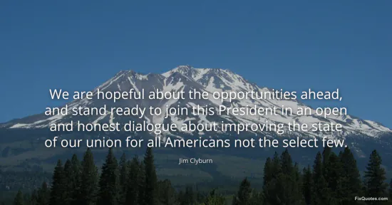 Clyburn, Jim. "We are hopeful about the opportunities ahead, and stand ready to join this President in an open and honest dialogue about improving the state of our union for all Americans not the select few." FixQuotes. January 17, 2026. https://fixquotes.com/quotes/we-are-hopeful-about-the-opportunities-ahead-and-70565/.