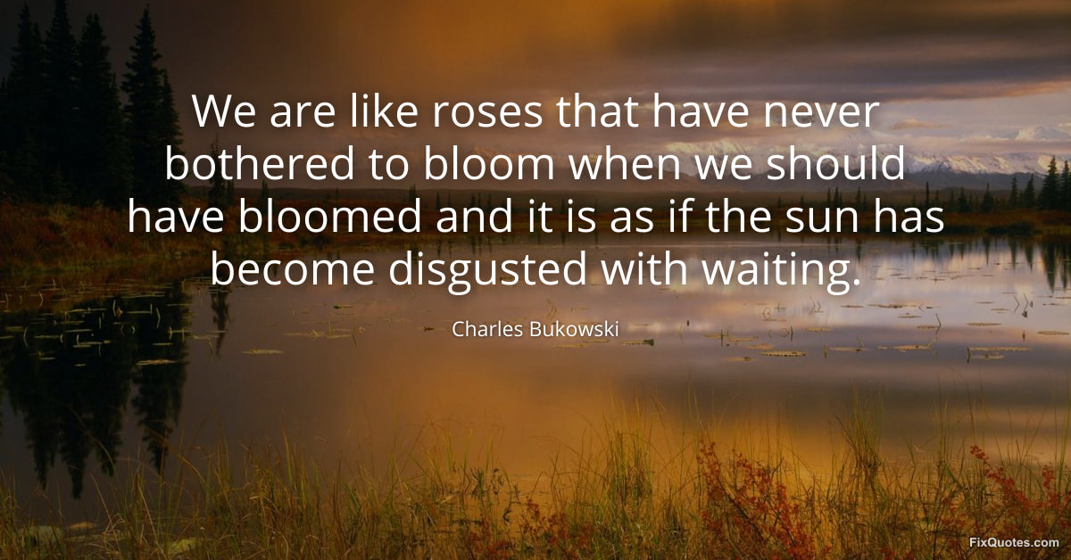 Bukowski, Charles. (2026, February 10). We are like roses that have never bothered to bloom when we should have bloomed and it is as if the sun has become disgusted with waiting. FixQuotes. https://fixquotes.com/quotes/we-are-like-roses-that-have-never-bothered-to-185228/