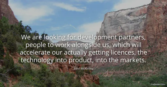 McKinley, John. "We are looking for development partners, people to work alongside us, which will accelerate our actually getting licences, the technology into product, into the markets." FixQuotes. January 16, 2026. https://fixquotes.com/quotes/we-are-looking-for-development-partners-people-to-120281/.