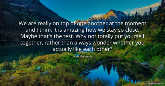 McCartney, Linda. "We are really on top of one another at the moment and I think it is amazing how we stay so close. Maybe that's the test. Why not totally put yourself together, rather than always wonder whether you actually like each other?" FixQuotes. January 16, 2026. https://fixquotes.com/quotes/we-are-really-on-top-of-one-another-at-the-moment-103809/.
