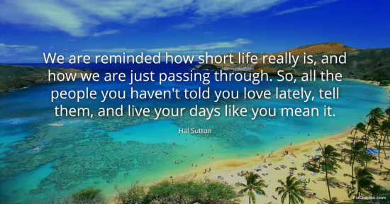 Sutton, Hal. "We are reminded how short life really is, and how we are just passing through. So, all the people you haven't told you love lately, tell them, and live your days like you mean it." FixQuotes. January 17, 2026. https://fixquotes.com/quotes/we-are-reminded-how-short-life-really-is-and-how-79307/.