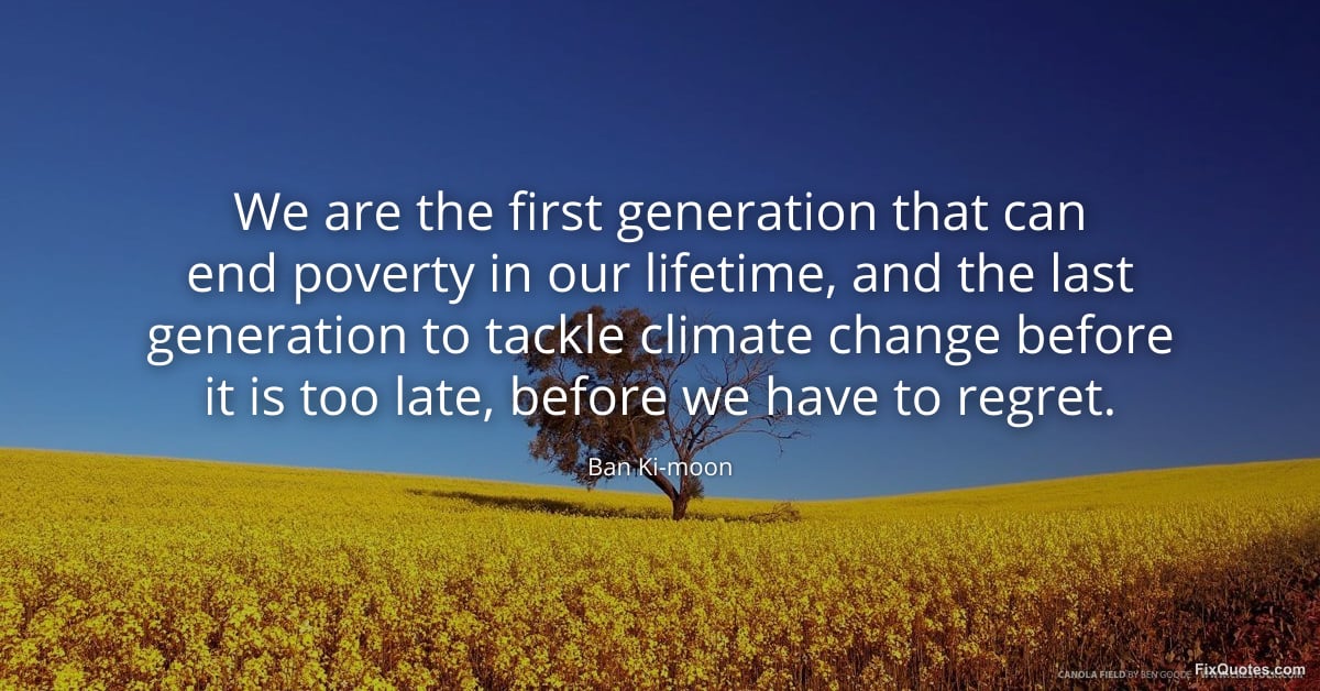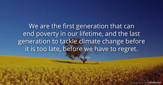 Ki-moon, Ban. "We are the first generation that can end poverty in our lifetime, and the last generation to tackle climate change before it is too late, before we have to regret." FixQuotes. March 8, 2026. https://fixquotes.com/quotes/we-are-the-first-generation-that-can-end-poverty-185754/.