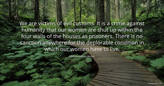 Jinnah, Muhammad Ali. "We are victims of evil customs. It is a crime against humanity that our women are shut up within the four walls of the houses as prisoners. There is no sanction anywhere for the deplorable condition in which our women have to live." FixQuotes. January 17, 2026. https://fixquotes.com/quotes/we-are-victims-of-evil-customs-it-is-a-crime-57159/.