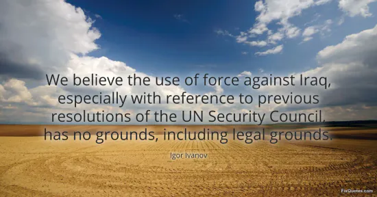 Ivanov, Igor. (2026, January 16). We believe the use of force against Iraq, especially with reference to previous resolutions of the UN Security Council, has no grounds, including legal grounds. FixQuotes. https://fixquotes.com/quotes/we-believe-the-use-of-force-against-iraq-122463/