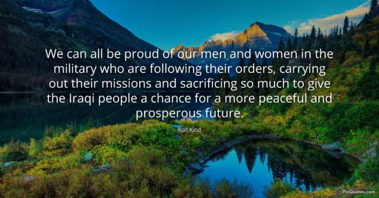 Kind, Ron. "We can all be proud of our men and women in the military who are following their orders, carrying out their missions and sacrificing so much to give the Iraqi people a chance for a more peaceful and prosperous future." FixQuotes. January 16, 2026. https://fixquotes.com/quotes/we-can-all-be-proud-of-our-men-and-women-in-the-112524/.