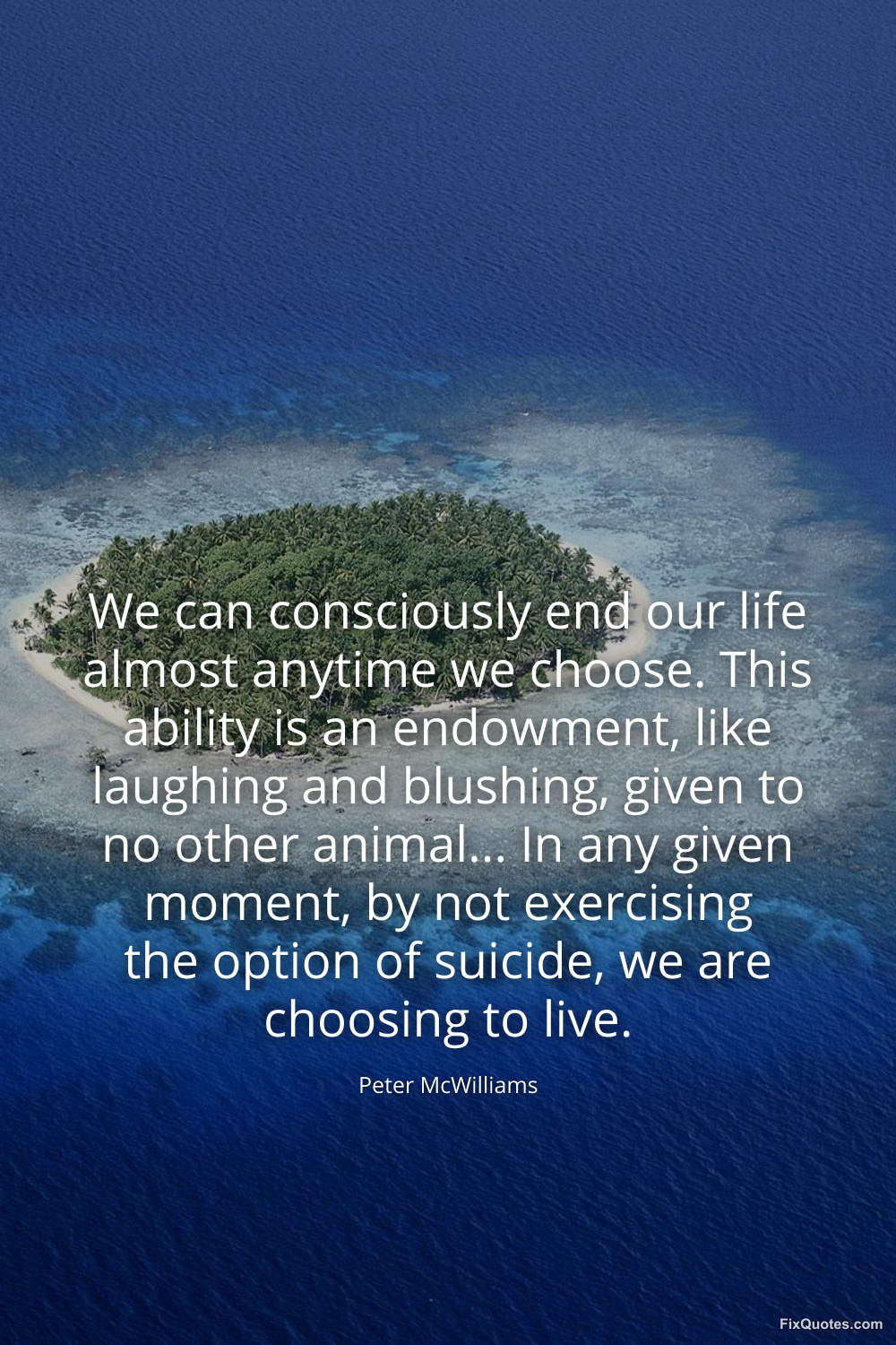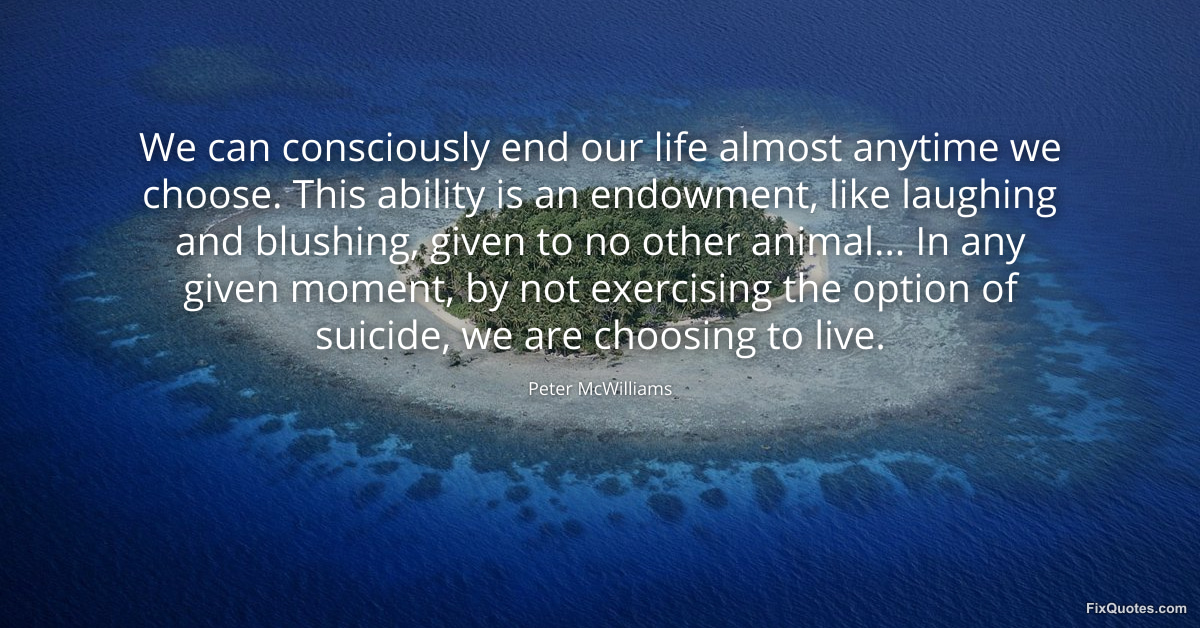 McWilliams, Peter. "We can consciously end our life almost anytime we choose. This ability is an endowment, like laughing and blushing, given to no other animal... In any given moment, by not exercising the option of suicide, we are choosing to live." FixQuotes. February 16, 2026. https://fixquotes.com/quotes/we-can-consciously-end-our-life-almost-anytime-we-134460/.