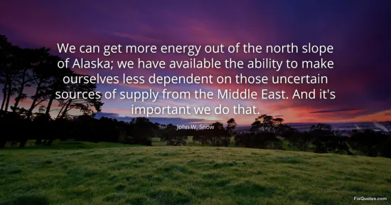 Snow, John W. "We can get more energy out of the north slope of Alaska; we have available the ability to make ourselves less dependent on those uncertain sources of supply from the Middle East. And it's important we do that." FixQuotes. January 18, 2026. https://fixquotes.com/quotes/we-can-get-more-energy-out-of-the-north-slope-of-20501/.