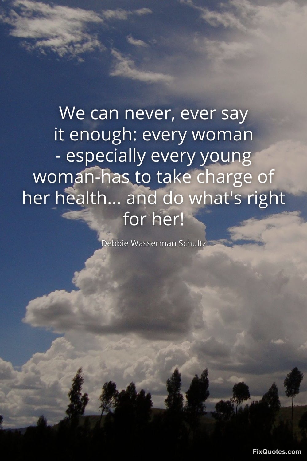 Schultz, Debbie Wasserman. (2026, January 17). We can never, ever say it enough: every woman - especially every young woman-has to take charge of her health... and do what's right for her! FixQuotes. https://fixquotes.com/quotes/we-can-never-ever-say-it-enough-every-woman-52554/