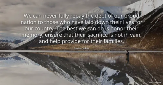 Collins, Susan. "We can never fully repay the debt of our proud nation to those who have laid down their lives for our country. The best we can do is honor their memory, ensure that their sacrifice is not in vain, and help provide for their families." FixQuotes. January 16, 2026. https://fixquotes.com/quotes/we-can-never-fully-repay-the-debt-of-our-proud-86545/.