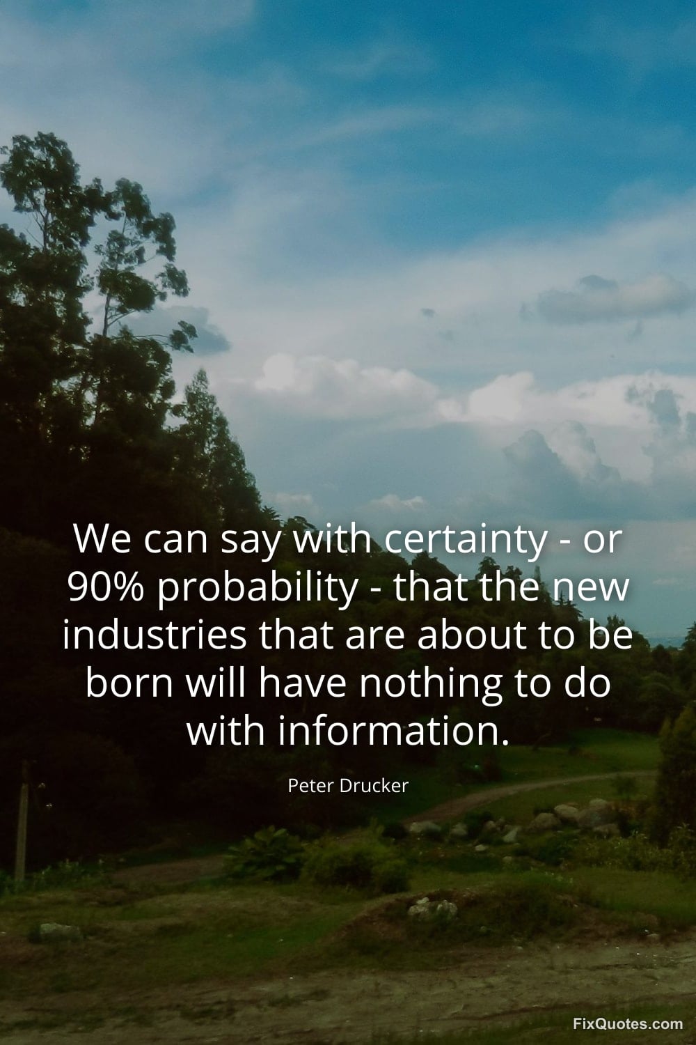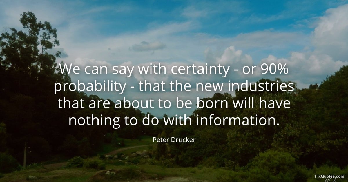 Drucker, Peter. (2026, January 17). We can say with certainty - or 90% probability - that the new industries that are about to be born will have nothing to do with information. FixQuotes. https://fixquotes.com/quotes/we-can-say-with-certainty-or-90-probability-29416/