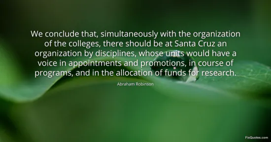 Robinson, Abraham. (2026, January 15). We conclude that, simultaneously with the organization of the colleges, there should be at Santa Cruz an organization by disciplines, whose units would have a voice in appointments and promotions, in course of programs, and in the allocation of funds for research. FixQuotes. https://fixquotes.com/quotes/we-conclude-that-simultaneously-with-the-161002/