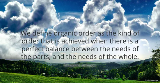 "We define organic order as the kind of order that is achieved when there is a perfect balance between the needs of the parts, and the needs of the whole." FixQuotes, 18 Jan. 2026, https://fixquotes.com/quotes/we-define-organic-order-as-the-kind-of-order-that-6897/. Accessed 12 Feb. 2026.