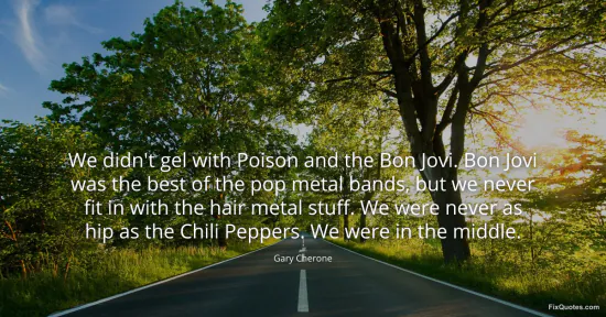 Cherone, Gary. (2026, January 17). We didn't gel with Poison and the Bon Jovi. Bon Jovi was the best of the pop metal bands, but we never fit in with the hair metal stuff. We were never as hip as the Chili Peppers. We were in the middle. FixQuotes. https://fixquotes.com/quotes/we-didnt-gel-with-poison-and-the-bon-jovi-bon-67686/