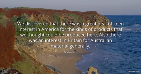 Macbeth, Ann. "We discovered that there was a great deal of keen interest in America for the kinds of products that we thought could be produced here. Also there was an interest in Britain for Australian material generally." FixQuotes. January 16, 2026. https://fixquotes.com/quotes/we-discovered-that-there-was-a-great-deal-of-keen-138344/.