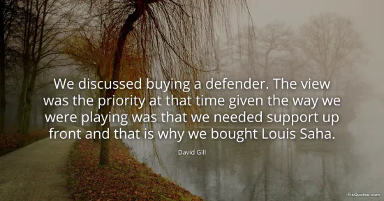 Gill, David. "We discussed buying a defender. The view was the priority at that time given the way we were playing was that we needed support up front and that is why we bought Louis Saha." FixQuotes. January 17, 2026. https://fixquotes.com/quotes/we-discussed-buying-a-defender-the-view-was-the-81560/.