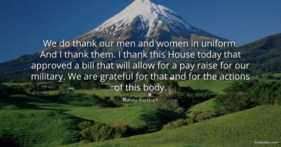 Blackburn, Marsha. "We do thank our men and women in uniform. And I thank them. I thank this House today that approved a bill that will allow for a pay raise for our military. We are grateful for that and for the actions of this body." FixQuotes. January 17, 2026. https://fixquotes.com/quotes/we-do-thank-our-men-and-women-in-uniform-and-i-81980/.