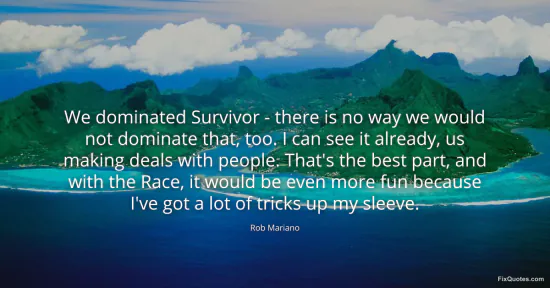 Mariano, Rob. "We dominated Survivor - there is no way we would not dominate that, too. I can see it already, us making deals with people. That's the best part, and with the Race, it would be even more fun because I've got a lot of tricks up my sleeve." FixQuotes. January 16, 2026. https://fixquotes.com/quotes/we-dominated-survivor-there-is-no-way-we-would-123262/.