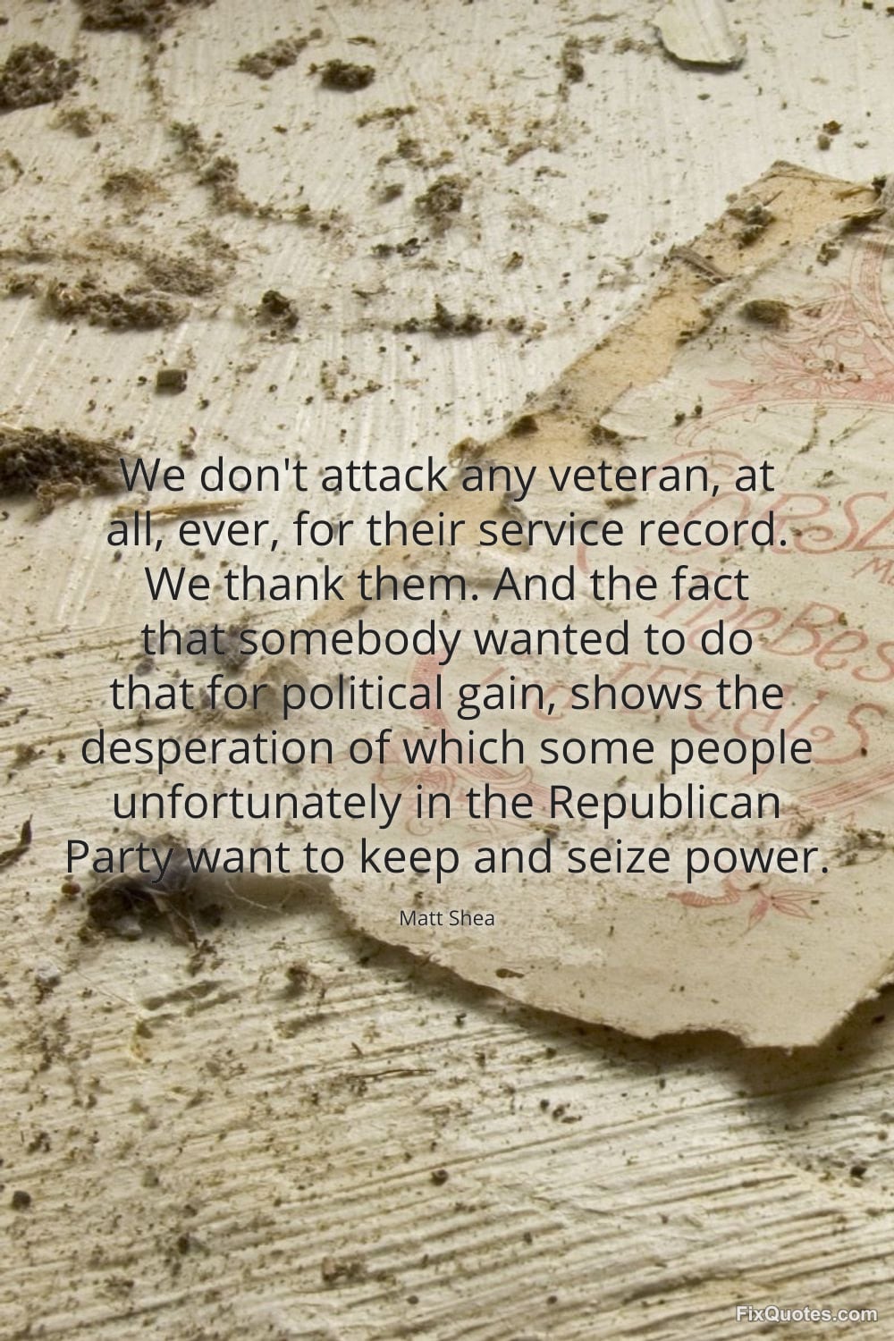 Shea, Matt. (2026, February 9). We don't attack any veteran, at all, ever, for their service record. We thank them. And the fact that somebody wanted to do that for political gain, shows the desperation of which some people unfortunately in the Republican Party want to keep and seize power. FixQuotes. https://fixquotes.com/quotes/we-dont-attack-any-veteran-at-all-ever-for-their-185012/