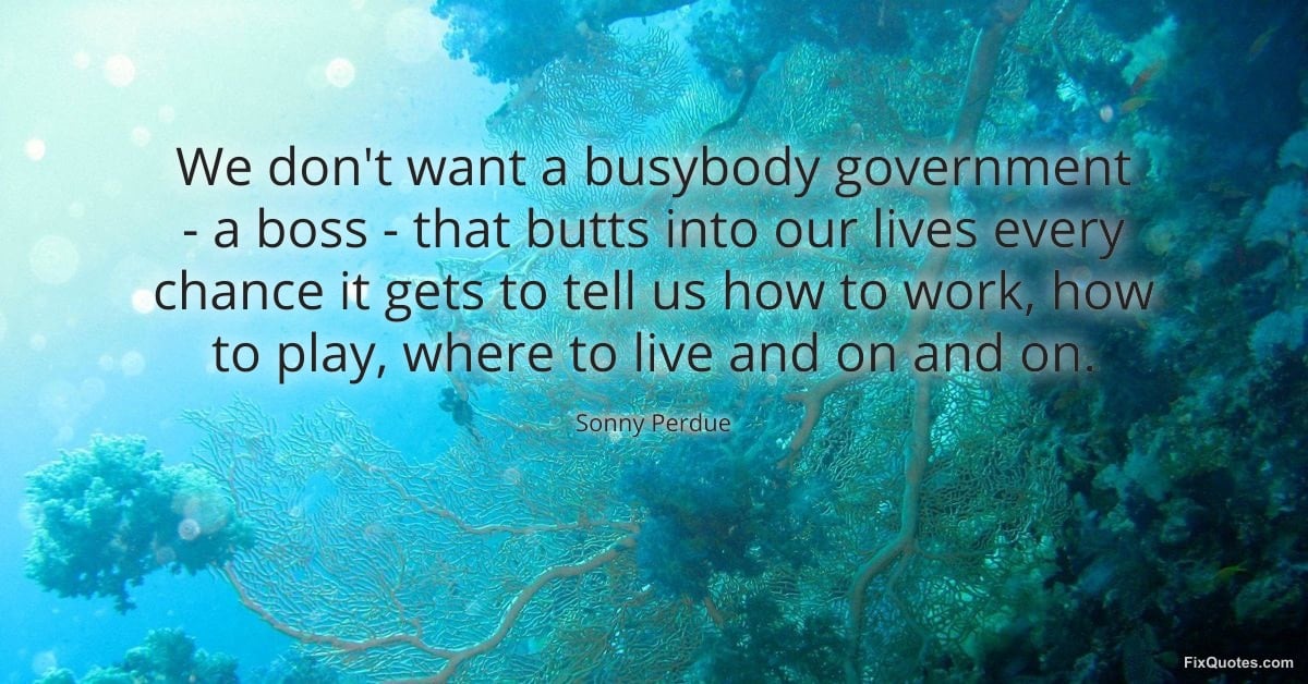 Perdue, Sonny. "We don't want a busybody government - a boss - that butts into our lives every chance it gets to tell us how to work, how to play, where to live and on and on." FixQuotes. January 16, 2026. https://fixquotes.com/quotes/we-dont-want-a-busybody-government-a-boss-83460/.