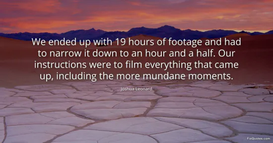 Leonard, Joshua. "We ended up with 19 hours of footage and had to narrow it down to an hour and a half. Our instructions were to film everything that came up, including the more mundane moments." FixQuotes. January 16, 2026. https://fixquotes.com/quotes/we-ended-up-with-19-hours-of-footage-and-had-to-103686/.