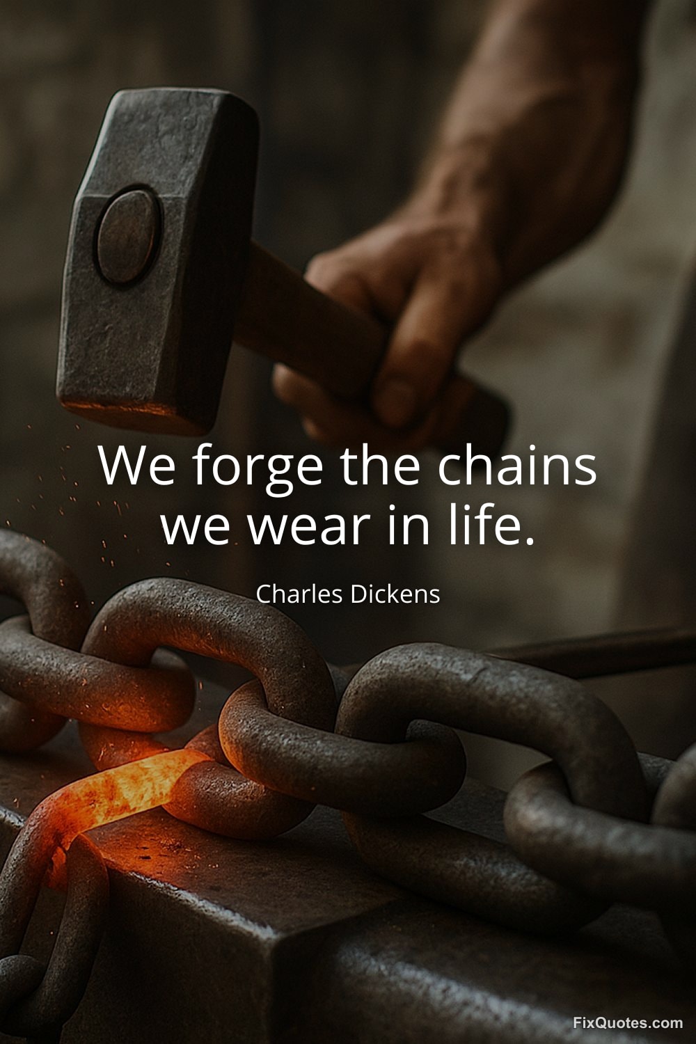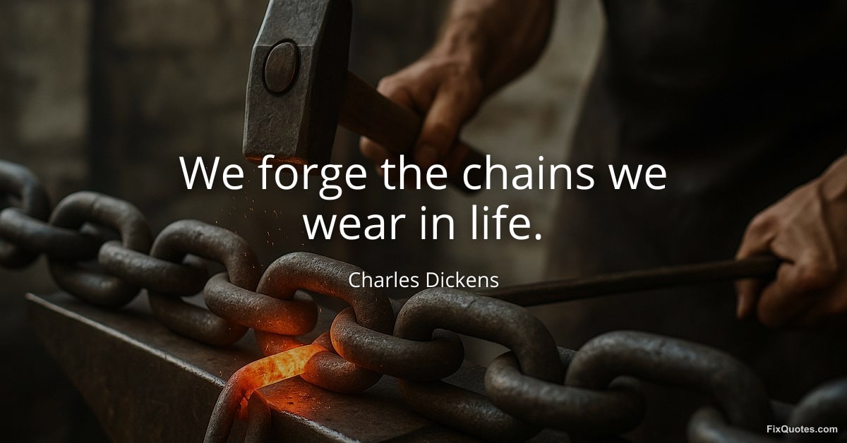 Dickens doesn’t just moralize here; he indicts. “We forge the chains we wear in life” lands like a courtroom line because it turns punishment into craftsmanship. Chains aren’t discovered, inherited, or imposed by some distant tyrant. They’re hammered out, link by link, by the same hands that later complain about the weight. The phrasing is industrial, almost tactile: forge suggests heat, effort, repetition. You can feel the labor of self-ruin.