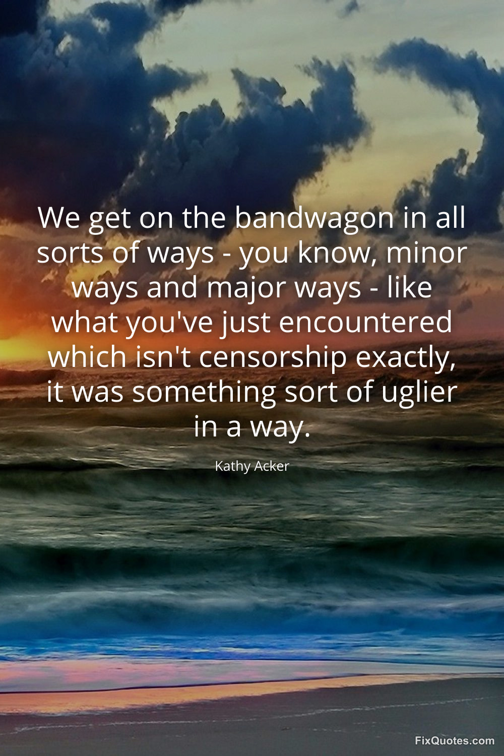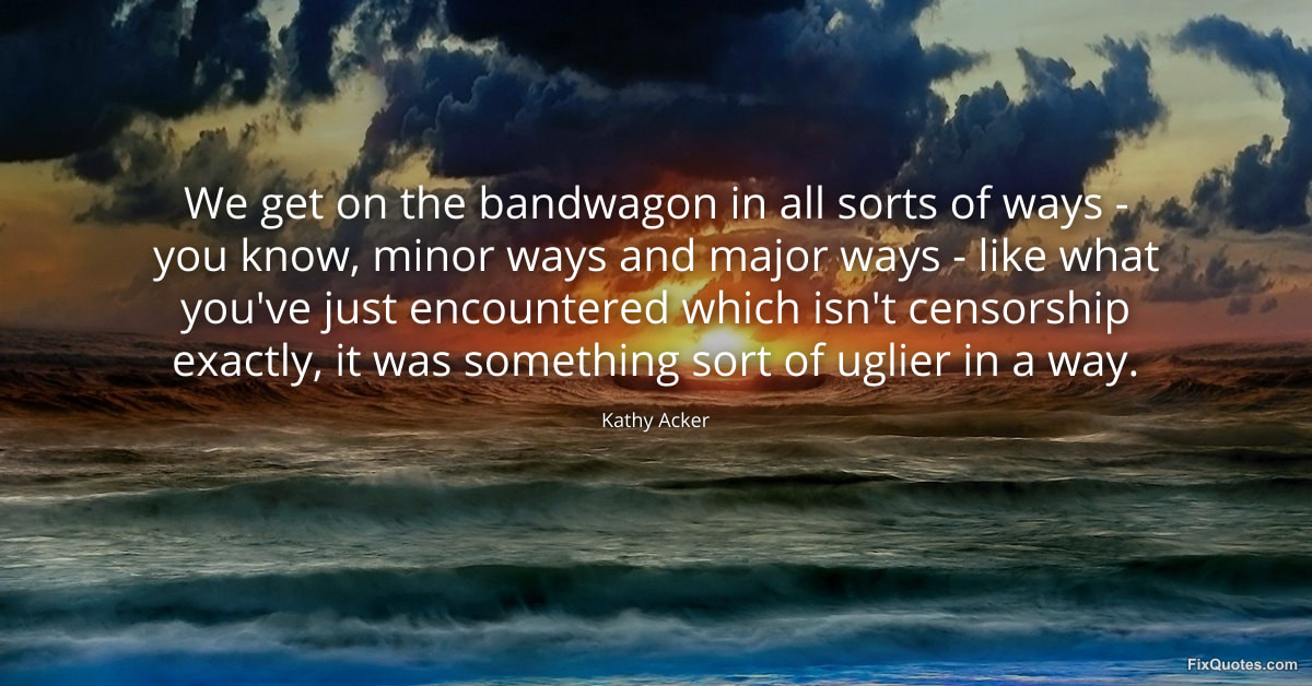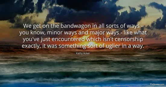 Acker, Kathy. (2026, February 16). We get on the bandwagon in all sorts of ways - you know, minor ways and major ways - like what you've just encountered which isn't censorship exactly, it was something sort of uglier in a way. FixQuotes. https://fixquotes.com/quotes/we-get-on-the-bandwagon-in-all-sorts-of-ways-135195/