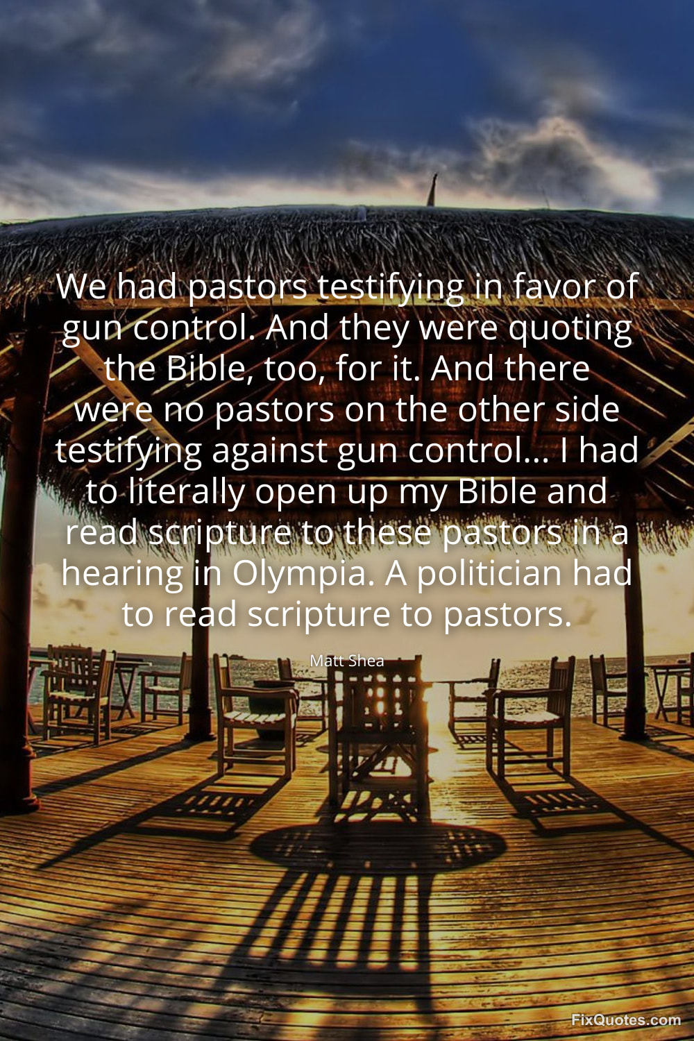 Shea, Matt. "We had pastors testifying in favor of gun control. And they were quoting the Bible, too, for it. And there were no pastors on the other side testifying against gun control... I had to literally open up my Bible and read scripture to these pastors in a hearing in Olympia. A politician had to read scripture to pastors." FixQuotes. February 9, 2026. https://fixquotes.com/quotes/we-had-pastors-testifying-in-favor-of-gun-control-185019/.