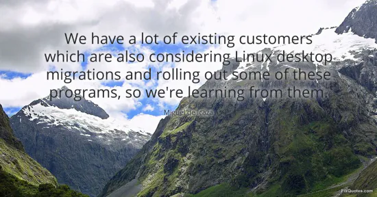 Icaza, Miguel de. "We have a lot of existing customers which are also considering Linux desktop migrations and rolling out some of these programs, so we're learning from them." FixQuotes. January 17, 2026. https://fixquotes.com/quotes/we-have-a-lot-of-existing-customers-which-are-64802/.