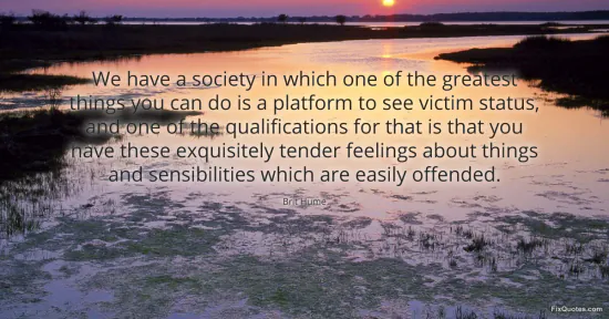 Hume, Brit. (2026, January 15). We have a society in which one of the greatest things you can do is a platform to see victim status, and one of the qualifications for that is that you have these exquisitely tender feelings about things and sensibilities which are easily offended. FixQuotes. https://fixquotes.com/quotes/we-have-a-society-in-which-one-of-the-greatest-40325/