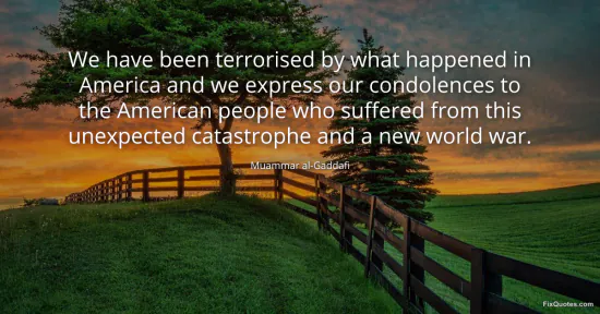 al-Gaddafi, Muammar. "We have been terrorised by what happened in America and we express our condolences to the American people who suffered from this unexpected catastrophe and a new world war." FixQuotes. January 16, 2026. https://fixquotes.com/quotes/we-have-been-terrorised-by-what-happened-in-127564/.