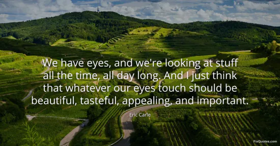 Carle, Eric. "We have eyes, and we're looking at stuff all the time, all day long. And I just think that whatever our eyes touch should be beautiful, tasteful, appealing, and important." FixQuotes. January 16, 2026. https://fixquotes.com/quotes/we-have-eyes-and-were-looking-at-stuff-all-the-127395/.