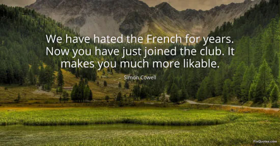 Cowell, Simon. (2026, January 17). We have hated the French for years. Now you have just joined the club. It makes you much more likable. FixQuotes. https://fixquotes.com/quotes/we-have-hated-the-french-for-years-now-you-have-65316/