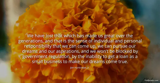 Jr., Jon Huntsman,. (2026, February 17). We have lost that which has made us great over the generations, and that is the sense of individual and personal responsibility that we can come up, we can pursue our dreams and our aspirations, and we won't be blocked by government regulation, by the inability to get a loan as a small business to make our dreams come true. FixQuotes. https://fixquotes.com/quotes/we-have-lost-that-which-has-made-us-great-over-52338/