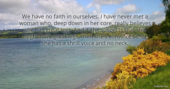 Heimel, Cynthia. "We have no faith in ourselves. I have never met a woman who, deep down in her core, really believes she has great legs. And if she suspects that she might have great legs, then she's convinced that she has a shrill voice and no neck." FixQuotes. January 16, 2026. https://fixquotes.com/quotes/we-have-no-faith-in-ourselves-i-have-never-met-a-128185/.