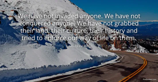 Kalam, Abdul. "We have not invaded anyone. We have not conquered anyone. We have not grabbed their land, their culture, their history and tried to enforce our way of life on them." FixQuotes. January 17, 2026. https://fixquotes.com/quotes/we-have-not-invaded-anyone-we-have-not-conquered-63363/.