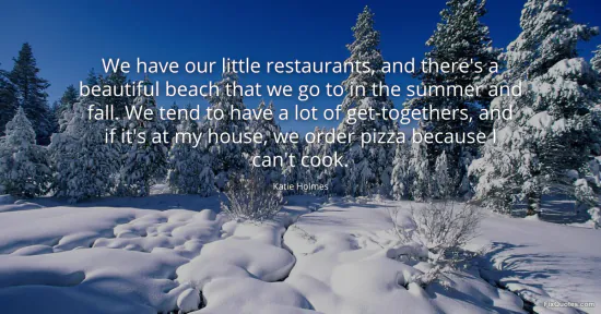 Holmes, Katie. "We have our little restaurants, and there's a beautiful beach that we go to in the summer and fall. We tend to have a lot of get-togethers, and if it's at my house, we order pizza because I can't cook." FixQuotes. January 15, 2026. https://fixquotes.com/quotes/we-have-our-little-restaurants-and-theres-a-146701/.
