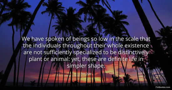 Gray, Asa. (2026, February 19). We have spoken of beings so low in the scale that the individuals throughout their whole existence are not sufficiently specialized to be distinctively plant or animal: yet, these are definite life in simpler shape. FixQuotes. https://fixquotes.com/quotes/we-have-spoken-of-beings-so-low-in-the-scale-that-45691/
