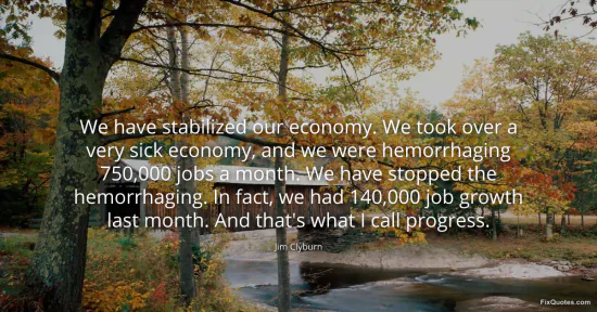 Clyburn, Jim. "We have stabilized our economy. We took over a very sick economy, and we were hemorrhaging 750,000 jobs a month. We have stopped the hemorrhaging. In fact, we had 140,000 job growth last month. And that's what I call progress." FixQuotes. Accessed February 2, 2026. https://fixquotes.com/quotes/we-have-stabilized-our-economy-we-took-over-a-76151/.