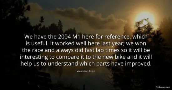 Rossi, Valentino. "We have the 2004 M1 here for reference, which is useful. It worked well here last year; we won the race and always did fast lap times so it will be interesting to compare it to the new bike and it will help us to understand which parts have improved." FixQuotes. January 16, 2026. https://fixquotes.com/quotes/we-have-the-2004-m1-here-for-reference-which-is-107701/.