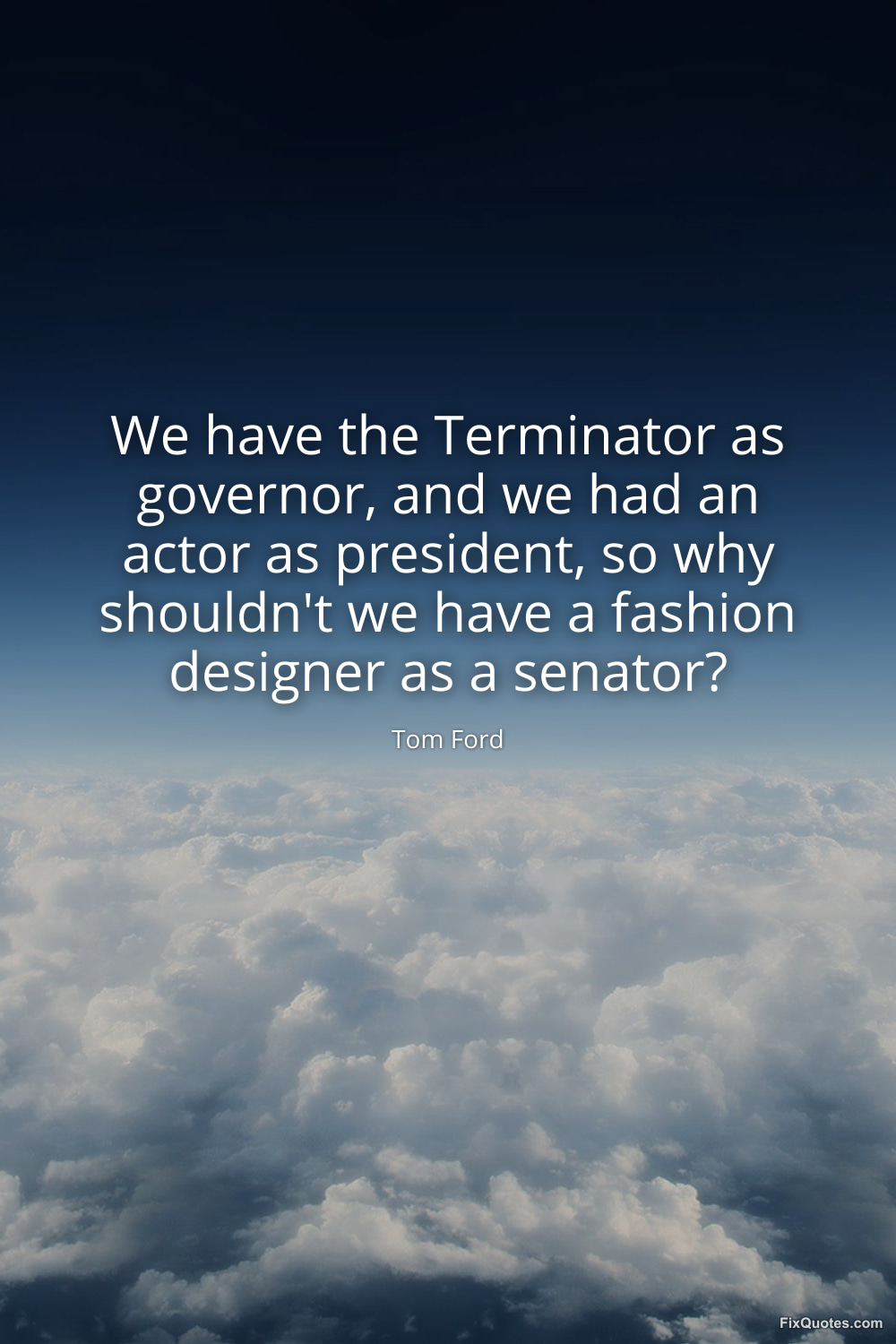 Ford, Tom. "We have the Terminator as governor, and we had an actor as president, so why shouldn't we have a fashion designer as a senator?" FixQuotes. January 18, 2026. https://fixquotes.com/quotes/we-have-the-terminator-as-governor-and-we-had-an-23297/.
