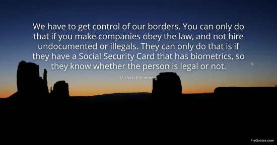 Bloomberg, Michael. (2026, February 18). We have to get control of our borders. You can only do that if you make companies obey the law, and not hire undocumented or illegals. They can only do that is if they have a Social Security Card that has biometrics, so they know whether the person is legal or not. FixQuotes. https://fixquotes.com/quotes/we-have-to-get-control-of-our-borders-you-can-73546/