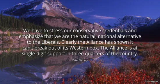 MacKay, Peter. "We have to stress our conservative credentials and emphasize that we are the natural, national alternative to the Liberals. Clearly the Alliance has shown it can't break out of its Western box. The Alliance is at single-digit support in three quarters of the country." FixQuotes. January 16, 2026. https://fixquotes.com/quotes/we-have-to-stress-our-conservative-credentials-128684/.