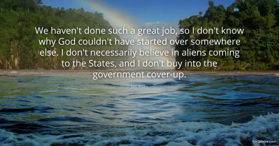 Ryan, Jeri. "We haven't done such a great job, so I don't know why God couldn't have started over somewhere else. I don't necessarily believe in aliens coming to the States, and I don't buy into the government cover-up." FixQuotes. January 17, 2026. https://fixquotes.com/quotes/we-havent-done-such-a-great-job-so-i-dont-know-49851/.