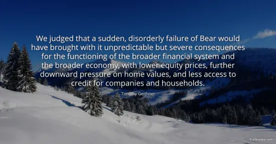 Geithner, Timothy. (2026, January 15). We judged that a sudden, disorderly failure of Bear would have brought with it unpredictable but severe consequences for the functioning of the broader financial system and the broader economy, with lower equity prices, further downward pressure on home values, and less access to credit for companies and households. FixQuotes. https://fixquotes.com/quotes/we-judged-that-a-sudden-disorderly-failure-of-166779/