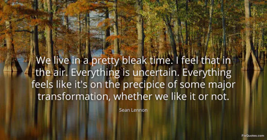 Lennon, Sean. (2026, February 16). We live in a pretty bleak time. I feel that in the air. Everything is uncertain. Everything feels like it's on the precipice of some major transformation, whether we like it or not. FixQuotes. https://fixquotes.com/quotes/we-live-in-a-pretty-bleak-time-i-feel-that-in-the-124757/