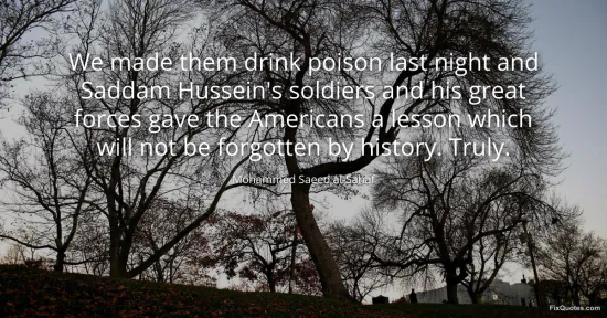 al-Sahaf, Mohammed Saeed. "We made them drink poison last night and Saddam Hussein's soldiers and his great forces gave the Americans a lesson which will not be forgotten by history. Truly." FixQuotes. January 16, 2026. https://fixquotes.com/quotes/we-made-them-drink-poison-last-night-and-saddam-115474/.