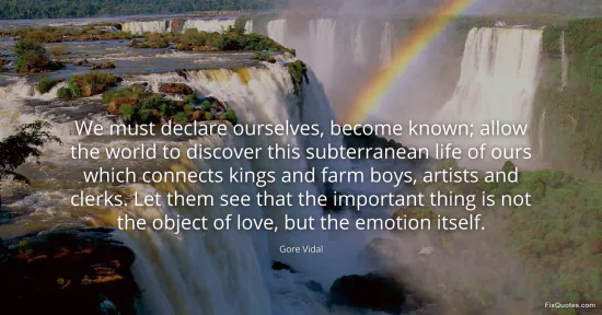 Vidal, Gore. (2026, January 17). We must declare ourselves, become known; allow the world to discover this subterranean life of ours which connects kings and farm boys, artists and clerks. Let them see that the important thing is not the object of love, but the emotion itself. FixQuotes. https://fixquotes.com/quotes/we-must-declare-ourselves-become-known-allow-the-66484/