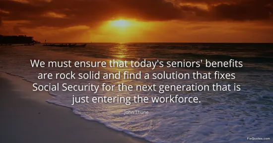 Thune, John. "We must ensure that today's seniors' benefits are rock solid and find a solution that fixes Social Security for the next generation that is just entering the workforce." FixQuotes. January 15, 2026. https://fixquotes.com/quotes/we-must-ensure-that-todays-seniors-benefits-are-165249/.