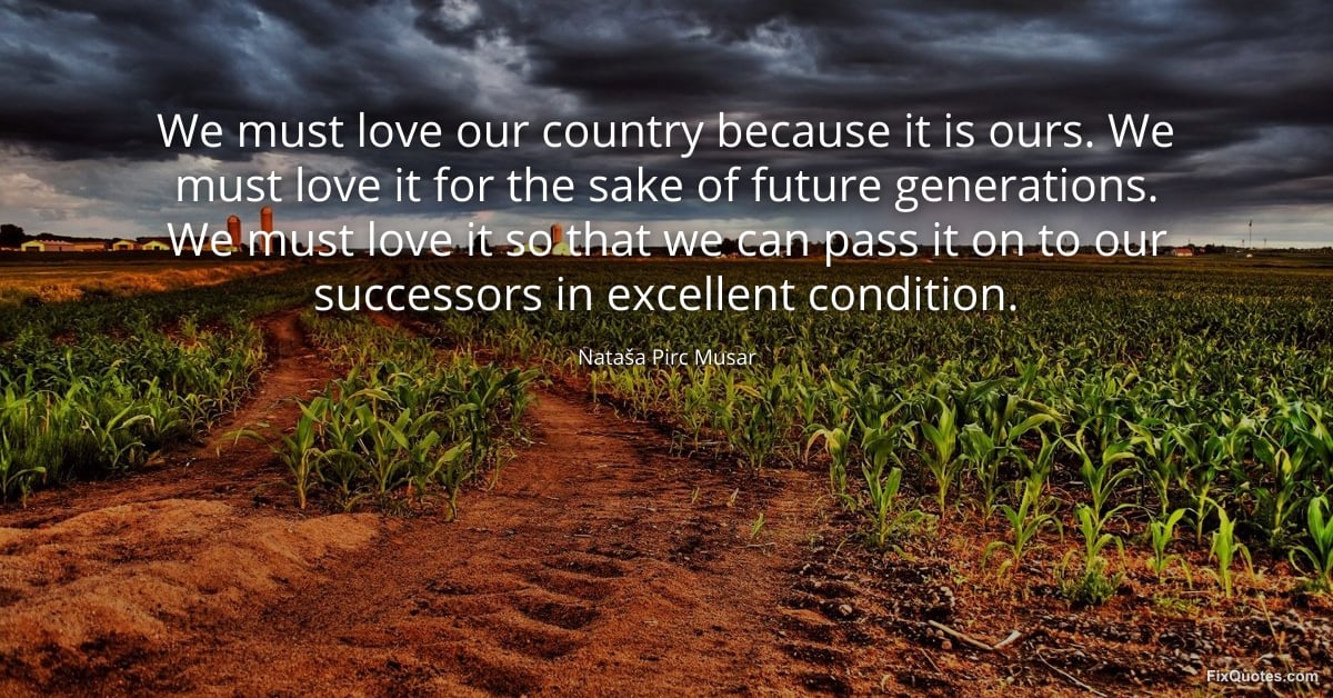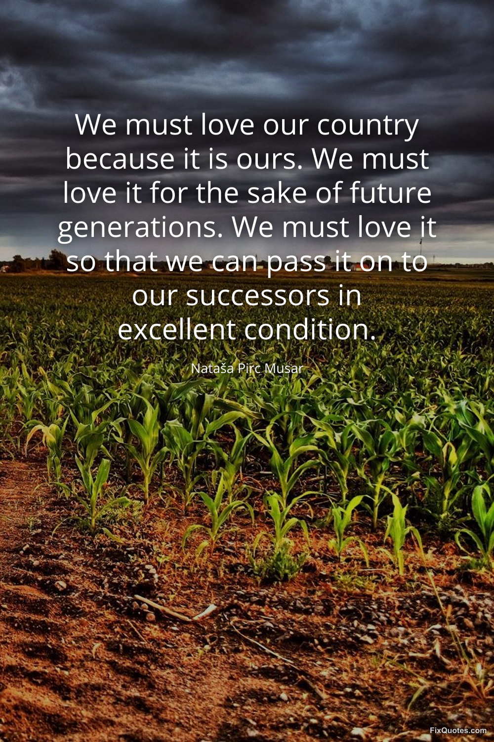 Musar, Nataša Pirc. (2026, February 18). We must love our country because it is ours. We must love it for the sake of future generations. We must love it so that we can pass it on to our successors in excellent condition. FixQuotes. https://fixquotes.com/quotes/we-must-love-our-country-because-it-is-ours-we-185632/