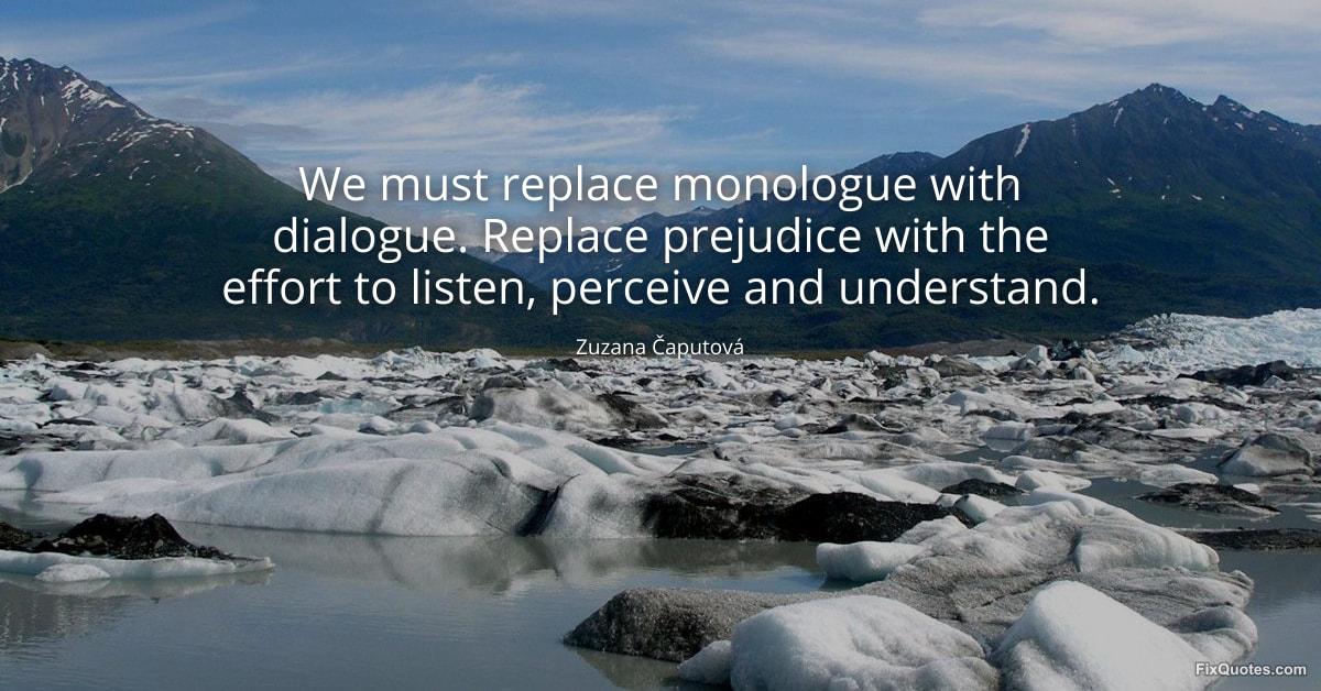 Caputova, Zuzana. (2026, February 15). We must replace monologue with dialogue. Replace prejudice with the effort to listen, perceive and understand. FixQuotes. https://fixquotes.com/quotes/we-must-replace-monologue-with-dialogue-replace-185462/
